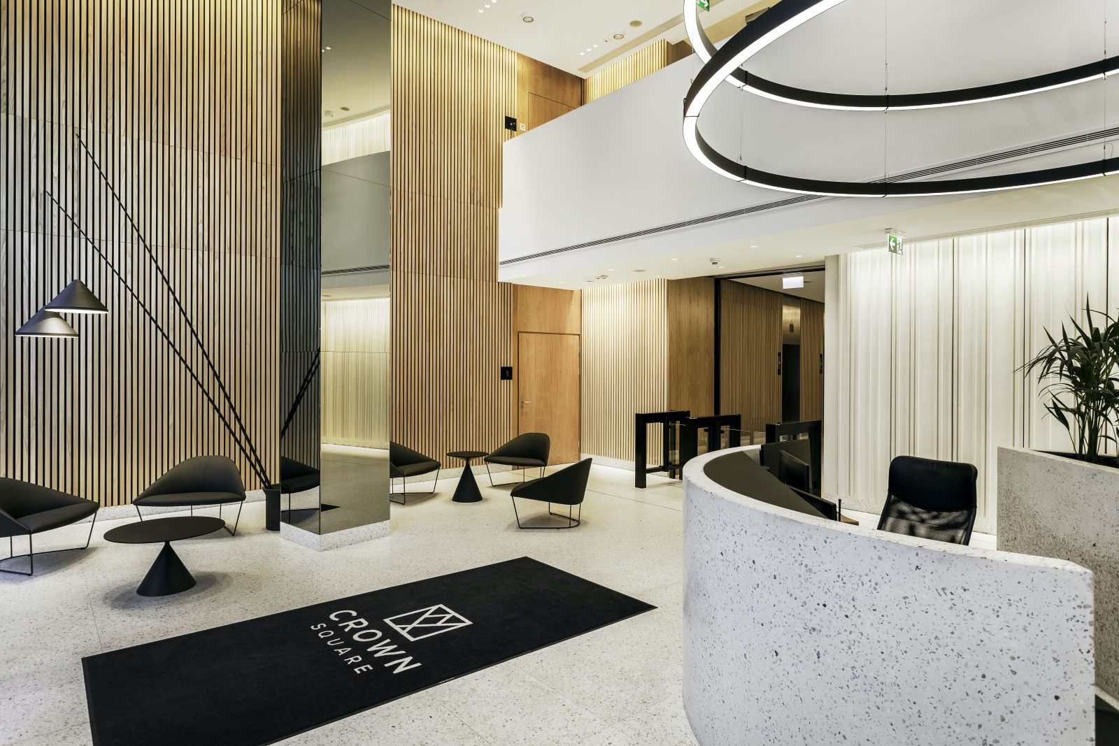 Crown Square to A-klasowy budynek biurowy. 13-to kondygnacyjny budynek to łącznie blisko 13 000 m2 powierzchni biurowej do wynajęcia. Fasada budynku jest podzielona pionowo na dwie części, a szklane elewacje zapewniają dostęp światła dziennego do wszystkich pomieszczeń. Parter budynku oferuje lokale handlowe i usługowe. Budynek wyróżnia się dobrą efektywnością ekologiczną, co potwierdza prestiżowy certyfikat BREEAM. Dla komfortu najemców budynek oferuje 3-poziomowy podziemny parking z 220 miejscami postojowymi. Crown Square zlokalizowany jest na Woli, w jednej z najszybciej rozwijających się dzielnic Warszawy, w pobliżu Ronda Daszyńskiego, blisko Centralnego Obszaru Biznesu. Lokalizacja umożliwia wygodny dojazd do innych części miasta, zarówno komunikacją miejską, jak i własnym samochodem. W okolicy znajdują się liczne przystanki autobusowe i tramwajowe, stacja metra Rondo Daszyńskiego oraz w niedalekiej odległości stacje kolejowe.